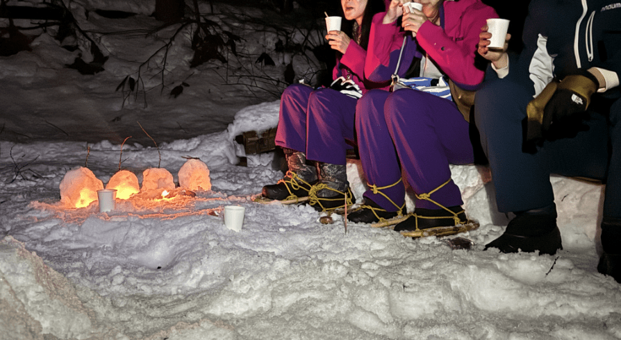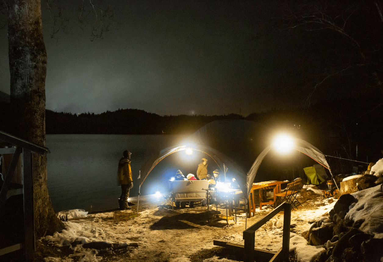 此為雪中露營方案,搭好帳篷後可以享用以當地食材製作的料理。