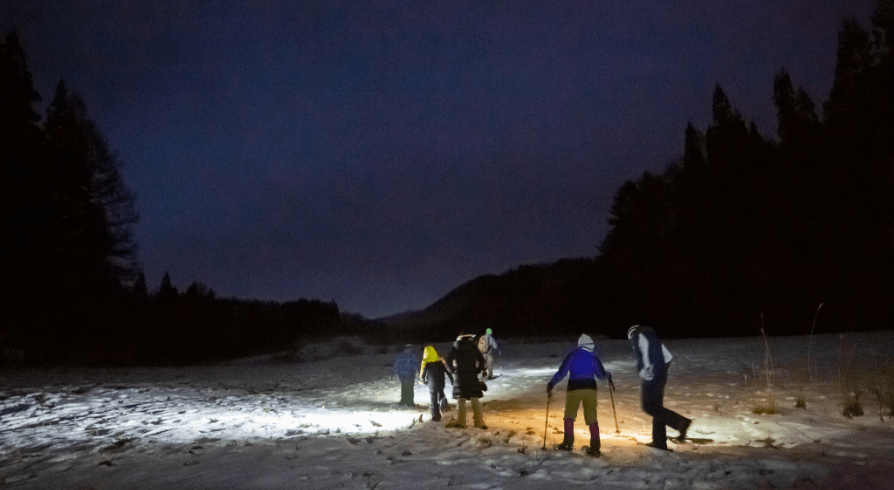 此方案會搭乘雪上摩托車進入森林,邊尋找夜行性的日本髭羚,邊在森林中漫步。