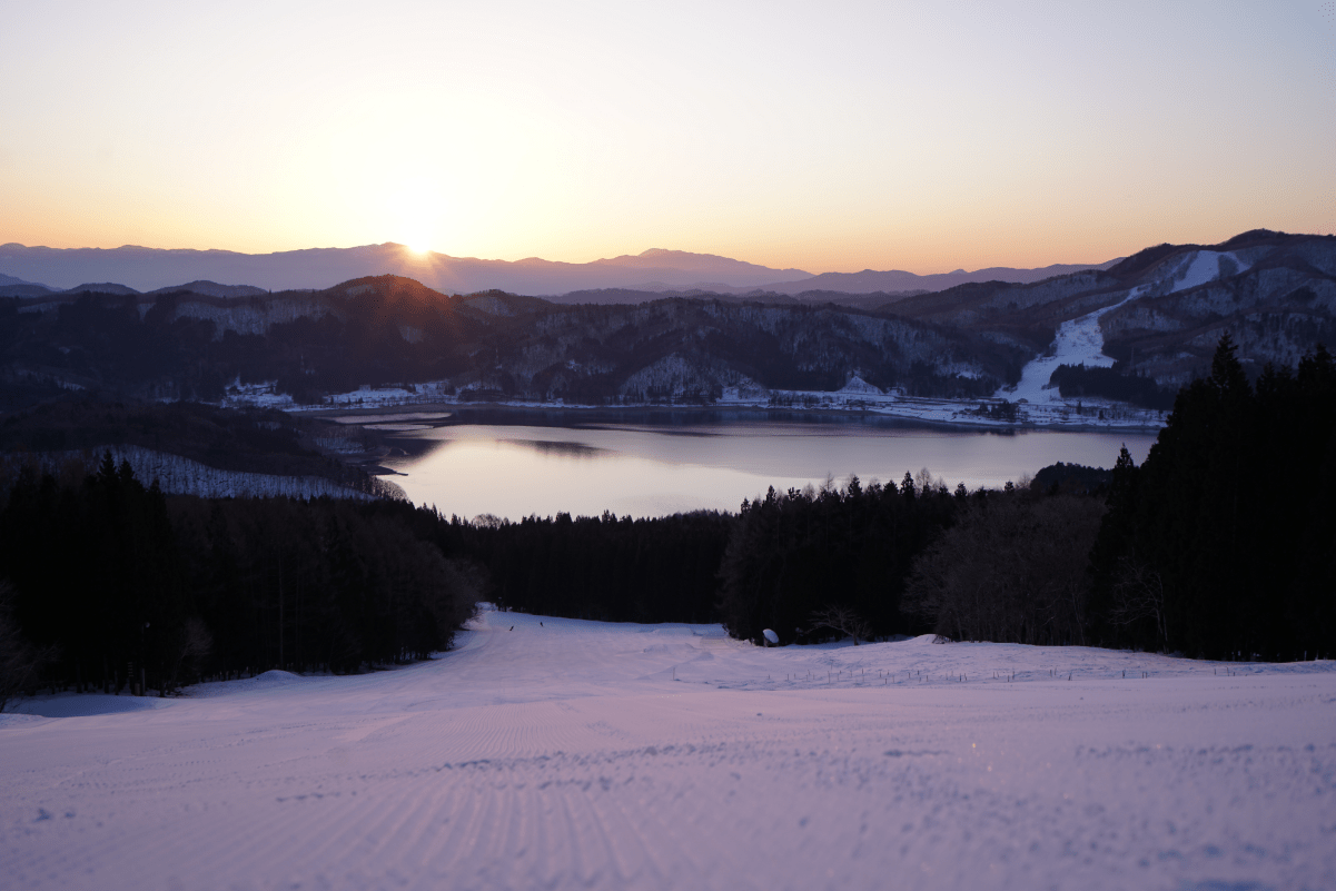 可在山頂欣賞日出從湖面升起的滑雪方案
