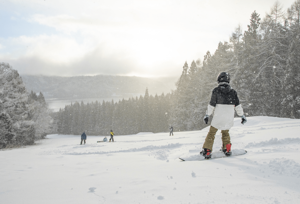 此方案會在滑雪場開始營業前的清晨,搭乘雪上摩托車前往山頂,欣賞朝陽從全日本透明度數一數二的青木湖升起後,接著享受滑過布滿新雪的雪道。