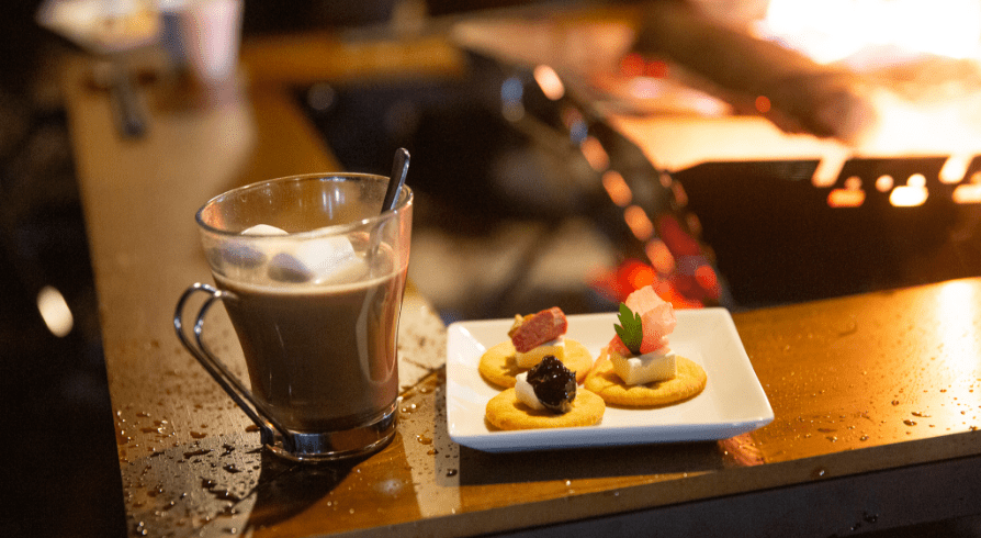 此為雪中露營方案,搭好帳篷後可以享用以當地食材製作的料理。